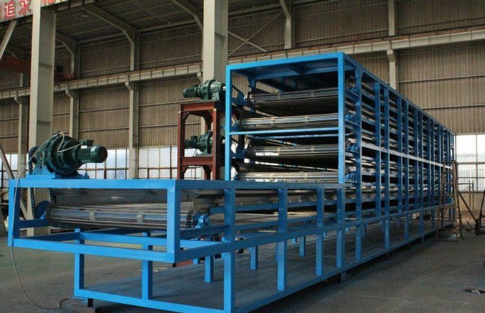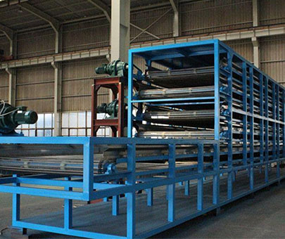 將物料均勻的平鋪在網(wǎng)帶上,網(wǎng)帶采用12-60目的鋼絲網(wǎng)帶,由傳動(dòng)裝置拖動(dòng)在干燥機(jī)內(nèi)往返移動(dòng),熱風(fēng)在物料間穿流而過(guò),水蒸氣從排濕孔中排出,從而達(dá)到干燥的目的,箱體長(zhǎng)度由標(biāo)準(zhǔn)段組合而成,為了節(jié)約烘干場(chǎng)地,可將烘干機(jī)制成多層式,常見(jiàn)的有二室三層、二室五層、長(zhǎng)度6-80m,有效寬度0.6-3.0m。